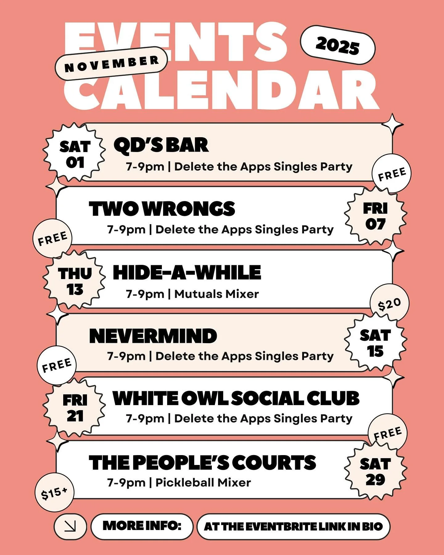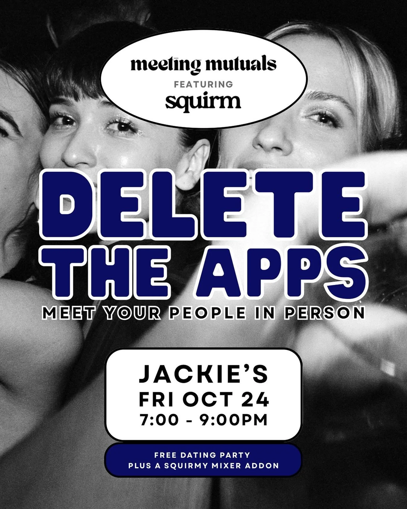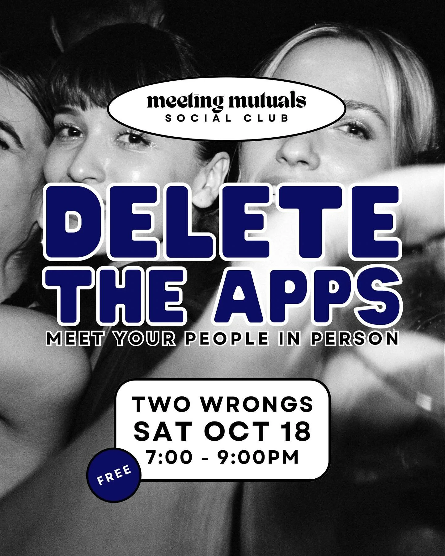 our events give you access to a network of people looking for the same things. our “delete the apps” parties are free to attend - we pick the venue, you show up and meet new friends and maybe even a new special someone. find out where we’re heading next at the link below.