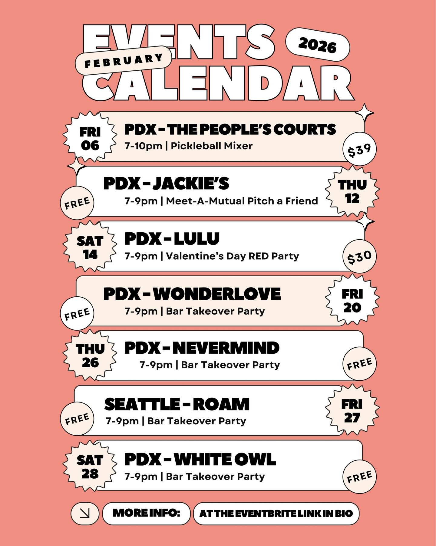 We host curated events and adventures around Portland that bring together friendly, like-minded locals for shared experiences. Whether itโs a casual bar night or a members-only meetup, our goal is to make meeting new people feel natural, fun, and meaningful.